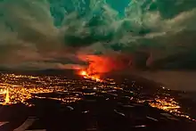 Le volcan Cumbre Vieja est entré en éruption dimanche 19 septembre 2021 peu après 15 heures locales (soit 14 heures GMT) 50 ans après sa précédente éruption, en 1971. La coulée de lave a détruit quasiment 3 000 bâtiments et entraîné l'évacuation de 7 000 personnes[9]. Au lendemain du début de l'éruption, l'Institut volcanologique des îles Canaries estime que cette phase d'activité du volcan devrait durer plusieurs semaines en raison de la présence d'une seconde poche de magma située à 20 ou 30 kilomètres de profondeur[10]. Une nouvelle langue de terre de 338 hectares en forme de " D " s'est déjà formée par la coulée de lave du volcan qui continue de s'accumuler dans l'océan, la silhouette de La Palma se transforme.