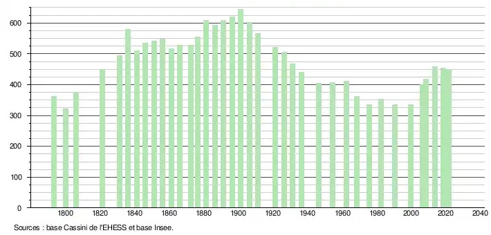 L'évolution du nombre d'habitants est connue à travers les recensements de la population effectués dans la commune depuis 1793. Pour les communes de moins de 10 000 habitants, une enquête de recensement portant sur toute la population est réalisée tous les cinq ans, les populations légales des années intermédiaires étant quant à elles estimées par interpolation ou extrapolation[30]. Pour la commune, le premier recensement exhaustif entrant dans le cadre du nouveau dispositif a été réalisé en 2008[31].