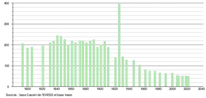 L'évolution du nombre d'habitants est connue à travers les recensements de la population effectués dans la commune depuis 1793. Pour les communes de moins de 10 000 habitants, une enquête de recensement portant sur toute la population est réalisée tous les cinq ans, les populations légales des années intermédiaires étant quant à elles estimées par interpolation ou extrapolation[18]. Pour la commune, le premier recensement exhaustif entrant dans le cadre du nouveau dispositif a été réalisé en 2008[19].