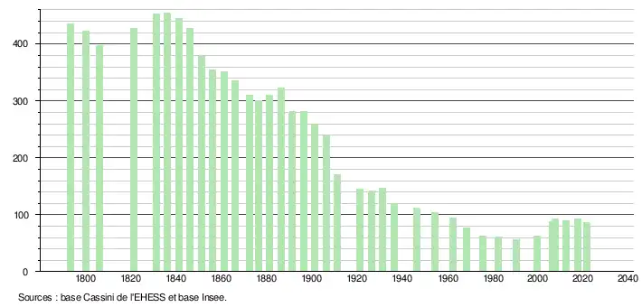 L'évolution du nombre d'habitants est connue à travers les recensements de la population effectués dans la commune depuis 1793. Pour les communes de moins de 10 000 habitants, une enquête de recensement portant sur toute la population est réalisée tous les cinq ans, les populations légales des années intermédiaires étant quant à elles estimées par interpolation ou extrapolation[21]. Pour la commune, le premier recensement exhaustif entrant dans le cadre du nouveau dispositif a été réalisé en 2007[22].