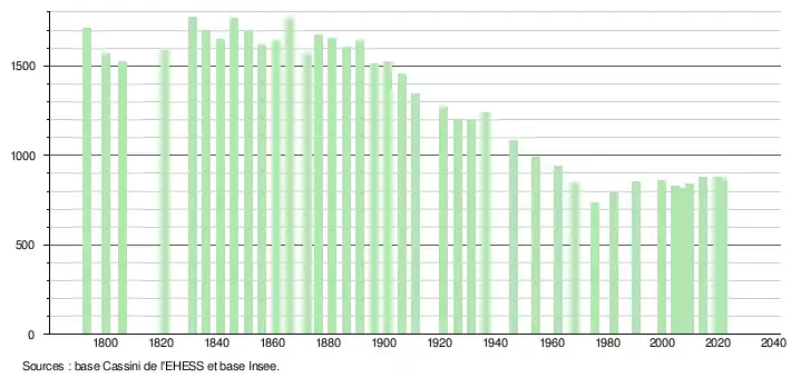 L'évolution du nombre d'habitants est connue à travers les recensements de la population effectués dans la commune depuis 1793. Pour les communes de moins de 10 000 habitants, une enquête de recensement portant sur toute la population est réalisée tous les cinq ans, les populations légales des années intermédiaires étant quant à elles estimées par interpolation ou extrapolation[18]. Pour la commune, le premier recensement exhaustif entrant dans le cadre du nouveau dispositif a été réalisé en 2004[19].