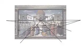 La scène principale est encadrée par les lignes en perspective d'un pavement à grosses dalles carrées en marbre d'une place décorée d'édifices monumentaux. Au centre selon les règles de la symétrie, une rangée centrale de dalles conduit à l'entrée d'un édifice remarquable à plan central avec coupole, symbole de l'universalité du pouvoir papal et transposition idéale du Temple de Jérusalem : Ce motif a été réutilisé dans Le Mariage de la Vierge (musée des beaux-arts de Caen) avec la variante de la porte centrale qui laisse voir le paysage comme infini dans le point de fuite central. Cette vision architecturale, expression des idéaux de perfection classique de la Renaissance a été reprise par les élèves du Pérugin, comme Pinturicchio dans la chapelle Bufalini et surtout Raphaël dans Le Mariage de la Vierge (Pinacothèque de Brera). Elle influença aussi Bramante qui la reproduisit dans le Tempietto.
