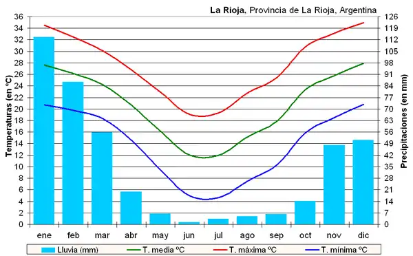 La Rioja a toutes les caractéristiques d'un climat continental. Les hivers y sont doux et secs avec des températures moyennes de plus ou moins 10 °C et des pluies rares, ainsi qu'une forte amplitude thermique quotidienne. Les étés sont pluvieux et chauds avec des températures moyennes de 28 °C et maximales de plus ou moins 35 °C, les plus hautes d'Argentine.