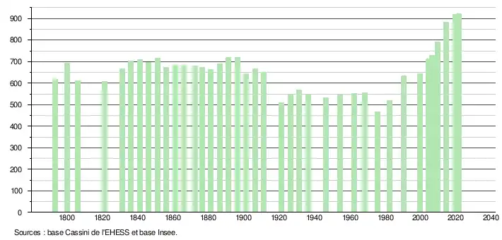 L'évolution du nombre d'habitants est connue à travers les recensements de la population effectués dans la commune depuis 1793. Pour les communes de moins de 10 000 habitants, une enquête de recensement portant sur toute la population est réalisée tous les cinq ans, les populations légales des années intermédiaires étant quant à elles estimées par interpolation ou extrapolation[31]. Pour la commune, le premier recensement exhaustif entrant dans le cadre du nouveau dispositif a été réalisé en 2004[32].