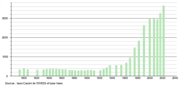 L'évolution du nombre d'habitants est connue à travers les recensements de la population effectués dans la commune depuis 1793. Pour les communes de moins de 10 000 habitants, une enquête de recensement portant sur toute la population est réalisée tous les cinq ans, les populations légales des années intermédiaires étant quant à elles estimées par interpolation ou extrapolation[24]. Pour la commune, le premier recensement exhaustif entrant dans le cadre du nouveau dispositif a été réalisé en 2006[25].