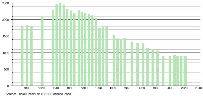 L'évolution du nombre d'habitants est connue à travers les recensements de la population effectués dans la commune depuis 1793. Pour les communes de moins de 10 000 habitants, une enquête de recensement portant sur toute la population est réalisée tous les cinq ans, les populations légales des années intermédiaires étant quant à elles estimées par interpolation ou extrapolation[13]. Pour la commune, le premier recensement exhaustif entrant dans le cadre du nouveau dispositif a été réalisé en 2005[14].