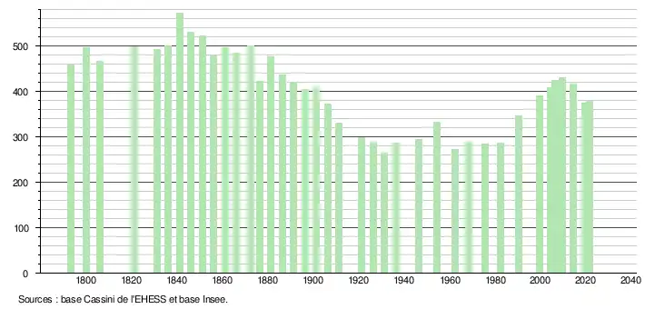 L'évolution du nombre d'habitants est connue à travers les recensements de la population effectués dans la commune depuis 1793. Pour les communes de moins de 10 000 habitants, une enquête de recensement portant sur toute la population est réalisée tous les cinq ans, les populations légales des années intermédiaires étant quant à elles estimées par interpolation ou extrapolation[16]. Pour la commune, le premier recensement exhaustif entrant dans le cadre du nouveau dispositif a été réalisé en 2004[17].