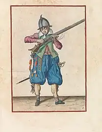 - sur la gauche, un milicien remplit de poudre le fût de son arquebuse, grâce à une des doses préparées à l'avance dans des tubes, qu'il porte suspendues autour de sa poitrine. Ces doses, outre qu'elles facilitent le dosage de la poudre et donc la fiabilité du tir, comprennent souvent également la bourre (tissu, papier) qu'on tasse sur la charge de poudre et la balle qui complète le chargement ;