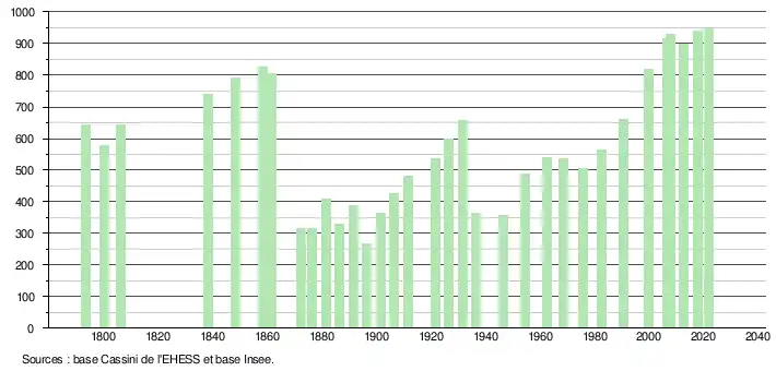 L'évolution du nombre d'habitants est connue à travers les recensements de la population effectués dans la commune depuis 1793. Pour les communes de moins de 10 000 habitants, une enquête de recensement portant sur toute la population est réalisée tous les cinq ans, les populations légales des années intermédiaires étant quant à elles estimées par interpolation ou extrapolation[30]. Pour la commune, le premier recensement exhaustif entrant dans le cadre du nouveau dispositif a été réalisé en 2007[31].