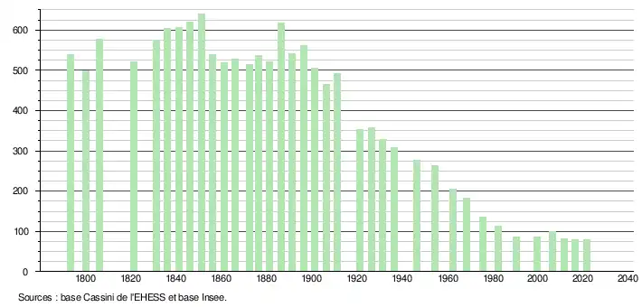 L'évolution du nombre d'habitants est connue à travers les recensements de la population effectués dans la commune depuis 1793. Pour les communes de moins de 10 000 habitants, une enquête de recensement portant sur toute la population est réalisée tous les cinq ans, les populations légales des années intermédiaires étant quant à elles estimées par interpolation ou extrapolation[17]. Pour la commune, le premier recensement exhaustif entrant dans le cadre du nouveau dispositif a été réalisé en 2006[18].