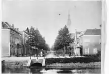 On a longtemps retenu l'idée d'une vue sur une maison promise à la démolition sur le Voldersgracht, prise depuis l'arrière de la « Mechelen », l'auberge de la place du Marché où avait habité Vermeer[2]. Il a cependant été prouvé que le peintre avait quitté l'auberge familiale dans le milieu des années 1650. Une hypothèse plus récente place alors cette vue dans la Nieuwe Langendijk, à côté du canal où Vermeer était en réalité installé à cette époque[3]. Si aucune preuve définitive ne permet à elle seule de trancher définitivement la question, un faisceau de présomptions a été avancé en faveur de cette dernière hypothèse, et plus précisément encore, entre les numéros 22 et 26. La démonstration s'appuie notamment sur le fait qu'il s'agit bien de maisons au bord d'un canal — en raison de la rigole d'écoulement qui va de la cour intérieure vers la ruelle —, prises de l'autre côté de celui-ci — par l'évaluation de la distance entre le peintre et son sujet —, et sur les caractéristiques architecturales des maisons de cette rue, aujourd'hui disparues, à partir des plans de l'époque.