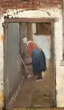 Au fond de l'allée à gauche de la maison, on distingue, également dans un encadrement de porte, une servante en capuchon et fichu blanc sur les épaules, chemise rouge, jupe et tablier bleus. Celle-ci est penchée sur un tonneau, vraisemblablement de récupération des eaux de pluie[1], dans lequel elle plonge les mains. Peut-être lave-t-elle le linge, ou s'apprête-t-elle à laver le sol à grande eau à l'aide du balai devant le tonneau, comme dans certains tableaux de Pieter de Hooch. De l'eau s'écoule en effet dans la rigole qui l'évacue vers la rue, et le canal.