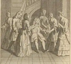 Aimwell — L'arrivée d'un étranger dans une église de campagne attire autant les regards que l'apparition d'une comète. Il n'est pas plutôt entré que les murmures parcourent la congrégation : « Qui est-ce ? D'où vient-il ? Le connaissez-vous ? ». Je donne alors une demi-couronne au suisse pour qu'il me conduise au meilleur banc de l'église. Je sors ma tabatière, je regarde autour de moi, salue l'officiant ou le recteur, sélectionne une beauté, rive mes yeux sur elle, montrant à toute l'assemblée mon intérêt par mes apparents efforts à le cacher. Après le sermon, tout le village me considère comme son amoureux. En persuadant la demoiselle que je suis prêt à mourir pour elle, elle tombe en toute bonne foi amoureuse de moi. |