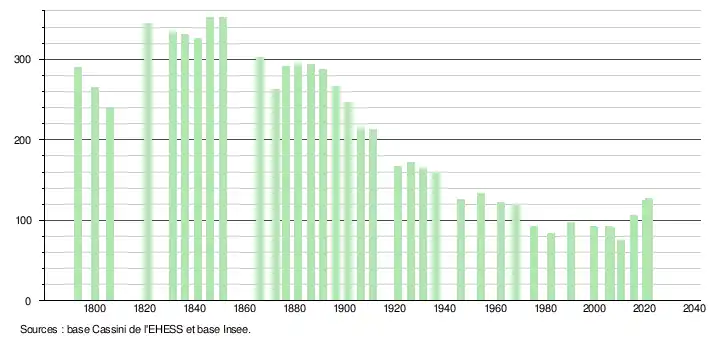 L'évolution du nombre d'habitants est connue à travers les recensements de la population effectués dans la commune depuis 1793. Pour les communes de moins de 10 000 habitants, une enquête de recensement portant sur toute la population est réalisée tous les cinq ans, les populations légales des années intermédiaires étant quant à elles estimées par interpolation ou extrapolation[19]. Pour la commune, le premier recensement exhaustif entrant dans le cadre du nouveau dispositif a été réalisé en 2005[20].