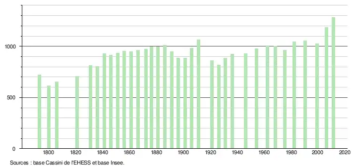 L'évolution du nombre d'habitants est connue à travers les recensements de la population effectués dans la commune depuis 1793. À partir du , les populations légales des communes sont publiées annuellement dans le cadre d'un recensement qui repose désormais sur une collecte d'information annuelle, concernant successivement tous les territoires communaux au cours d'une période de cinq ans. Pour les communes de moins de 10 000 habitants, une enquête de recensement portant sur toute la population est réalisée tous les cinq ans, les populations légales des années intermédiaires étant quant à elles estimées par interpolation ou extrapolation[10]. Pour la commune, le premier recensement exhaustif entrant dans le cadre du nouveau dispositif a été réalisé en 2006[11],[Note 1].