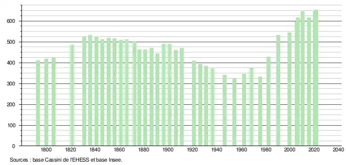 L'évolution du nombre d'habitants est connue à travers les recensements de la population effectués dans la commune depuis 1793. Pour les communes de moins de 10 000 habitants, une enquête de recensement portant sur toute la population est réalisée tous les cinq ans, les populations légales des années intermédiaires étant quant à elles estimées par interpolation ou extrapolation[17]. Pour la commune, le premier recensement exhaustif entrant dans le cadre du nouveau dispositif a été réalisé en 2005[18].