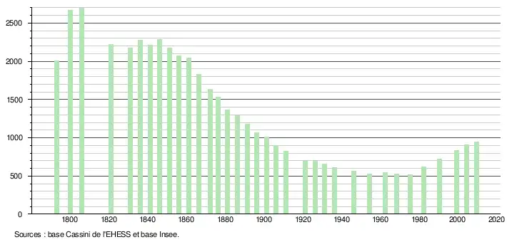- Dans le tableau des recensements et le graphique, par convention dans Wikipédia, le principe a été retenu, pour les populations légales postérieures à 1999 de n’afficher dans le tableau des recensements et le graphique que les populations correspondant à l'année 2006, première population légale publiée calculée conformément aux concepts définis dans le décret no 2003-485 du 5 juin 2003, et les années correspondant à une enquête exhaustive de recensement pour les communes de moins de 10 000 habitants, ainsi que la dernière population légale publiée par l’Insee.