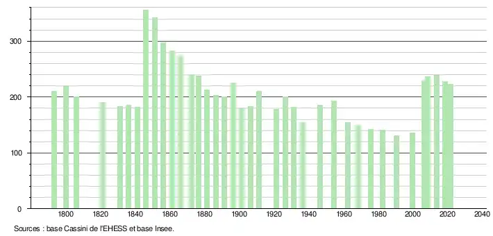 L'évolution du nombre d'habitants est connue à travers les recensements de la population effectués dans la commune depuis 1793. Pour les communes de moins de 10 000 habitants, une enquête de recensement portant sur toute la population est réalisée tous les cinq ans, les populations légales des années intermédiaires étant quant à elles estimées par interpolation ou extrapolation[23]. Pour la commune, le premier recensement exhaustif entrant dans le cadre du nouveau dispositif a été réalisé en 2008[24].