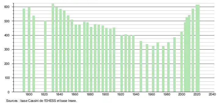 L'évolution du nombre d'habitants est connue à travers les recensements de la population effectués dans la commune depuis 1793. Pour les communes de moins de 10 000 habitants, une enquête de recensement portant sur toute la population est réalisée tous les cinq ans, les populations légales des années intermédiaires étant quant à elles estimées par interpolation ou extrapolation[24]. Pour la commune, le premier recensement exhaustif entrant dans le cadre du nouveau dispositif a été réalisé en 2004[25].