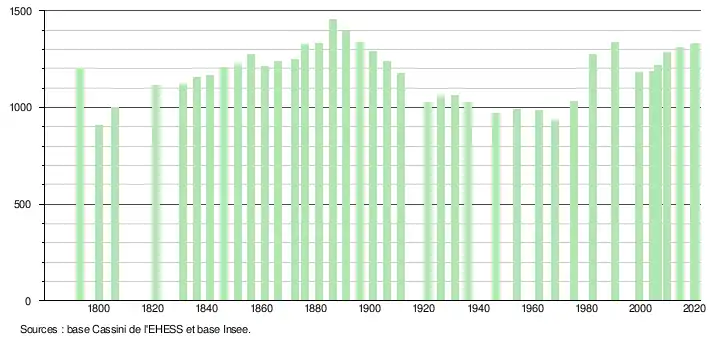 L'évolution du nombre d'habitants est connue à travers les recensements de la population effectués dans la commune depuis 1793. Pour les communes de moins de 10 000 habitants, une enquête de recensement portant sur toute la population est réalisée tous les cinq ans, les populations légales des années intermédiaires étant quant à elles estimées par interpolation ou extrapolation[16]. Pour la commune, le premier recensement exhaustif entrant dans le cadre du nouveau dispositif a été réalisé en 2004[17].