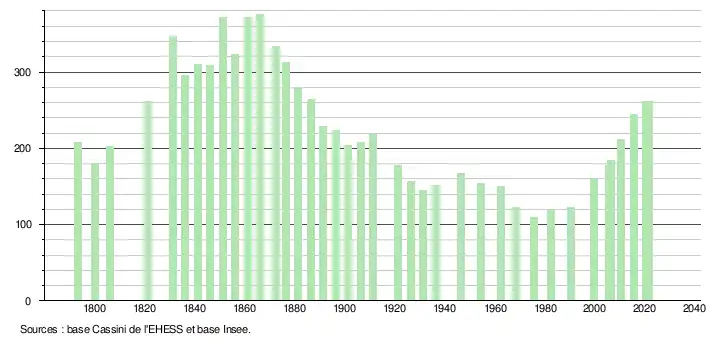 L'évolution du nombre d'habitants est connue à travers les recensements de la population effectués dans la commune depuis 1793. Pour les communes de moins de 10 000 habitants, une enquête de recensement portant sur toute la population est réalisée tous les cinq ans, les populations légales des années intermédiaires étant quant à elles estimées par interpolation ou extrapolation[22]. Pour la commune, le premier recensement exhaustif entrant dans le cadre du nouveau dispositif a été réalisé en 2005[23].
