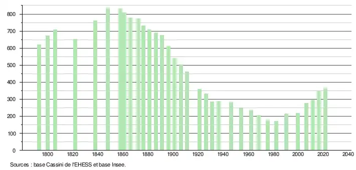 L'évolution du nombre d'habitants est connue à travers les recensements de la population effectués dans la commune depuis 1793. Pour les communes de moins de 10 000 habitants, une enquête de recensement portant sur toute la population est réalisée tous les cinq ans, les populations légales des années intermédiaires étant quant à elles estimées par interpolation ou extrapolation[11]. Pour la commune, le premier recensement exhaustif entrant dans le cadre du nouveau dispositif a été réalisé en 2006[12].