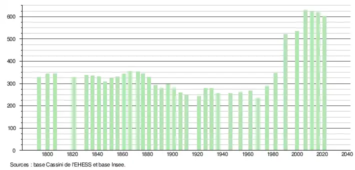 L'évolution du nombre d'habitants est connue à travers les recensements de la population effectués dans la commune depuis 1793. Pour les communes de moins de 10 000 habitants, une enquête de recensement portant sur toute la population est réalisée tous les cinq ans, les populations légales des années intermédiaires étant quant à elles estimées par interpolation ou extrapolation[19]. Pour la commune, le premier recensement exhaustif entrant dans le cadre du nouveau dispositif a été réalisé en 2006[20].