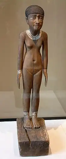 L'art de l'Égypte antique comporte de nombreux bas-reliefs. Ceux-ci ayant un rôle religieux et politique, ils représentent les corps suivant un schéma de proportions précis et codifié[11]. La taille des figures dépend ainsi de l'importance hiérarchique, du statut de chaque personne représentée ; dans ce contexte la nudité indique un statut servile, comme on peut par exemple sur la fresque des danseuses. Le nu apparait aussi dans ce bas relief représentant une princesse de la période amarnienne. La XVIIIe dynastie, à laquelle appartient la période amarnienne, ayant été particulièrement sensible à une représentation « réaliste » de la réalité visible, tout autant que la manifestation de la vie spirituelle.