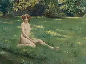 Les nus impressionnistes empruntèrent à l'école réaliste un goût pour le quotidien, en opérant toutefois un retour marqué à certaines scènes bucoliques, idéalisées. Un des initiateurs du mouvement fut Édouard Manet qui provoqua un scandale au Salon des Refusés en 1863 en présentant le Déjeuner sur l'herbe, où une femme entièrement nue participe à un simple pique-nique dans la nature en compagnie d'hommes habillés. La culture ou la sincérité des critiques peut être mise en cause, puisqu'un seul remarqua que le tableau était une reprise du Concert champêtre de Giorgione, que Manet avait vu en Italie[47]. Le nu suivant, de nouveau une variation sur un classique italien (la Vénus d'Urbino du Titien), Olympia provoqua encore un tollé car il représentait une femme ordinaire, probablement une prostituée, nue mais ayant gardé son collier, un bracelet et ses mules aux pieds et accompagnée d'une domestique noire (lui présentant peut-être le bouquet d'un admirateur) et d'un chaton noir.