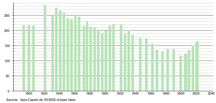 L'évolution du nombre d'habitants est connue à travers les recensements de la population effectués dans la commune depuis 1793. Pour les communes de moins de 10 000 habitants, une enquête de recensement portant sur toute la population est réalisée tous les cinq ans, les populations légales des années intermédiaires étant quant à elles estimées par interpolation ou extrapolation[21]. Pour la commune, le premier recensement exhaustif entrant dans le cadre du nouveau dispositif a été réalisé en 2005[22].