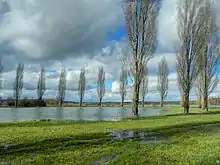 Le lac est bordé par de multiples arbres d'alignement.