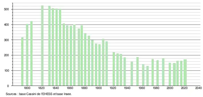 L'évolution du nombre d'habitants est connue à travers les recensements de la population effectués dans la commune depuis 1793. Pour les communes de moins de 10 000 habitants, une enquête de recensement portant sur toute la population est réalisée tous les cinq ans, les populations légales des années intermédiaires étant quant à elles estimées par interpolation ou extrapolation[22]. Pour la commune, le premier recensement exhaustif entrant dans le cadre du nouveau dispositif a été réalisé en 2005[23].