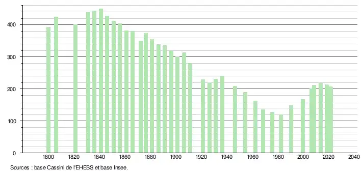- Population municipale légale en vigueur au 1er janvier 2024, millésimée 2021, définie dans les limites territoriales en vigueur au 1er janvier 2023, date de référence statistique : 1er janvier 2021.