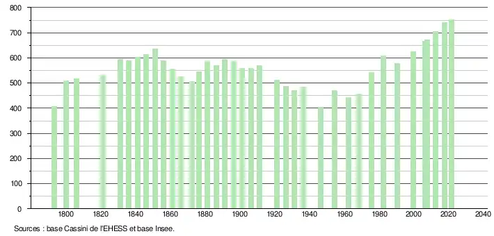L'évolution du nombre d'habitants est connue à travers les recensements de la population effectués dans la commune depuis 1793. Pour les communes de moins de 10 000 habitants, une enquête de recensement portant sur toute la population est réalisée tous les cinq ans, les populations légales des années intermédiaires étant quant à elles estimées par interpolation ou extrapolation[23]. Pour la commune, le premier recensement exhaustif entrant dans le cadre du nouveau dispositif a été réalisé en 2007[24].