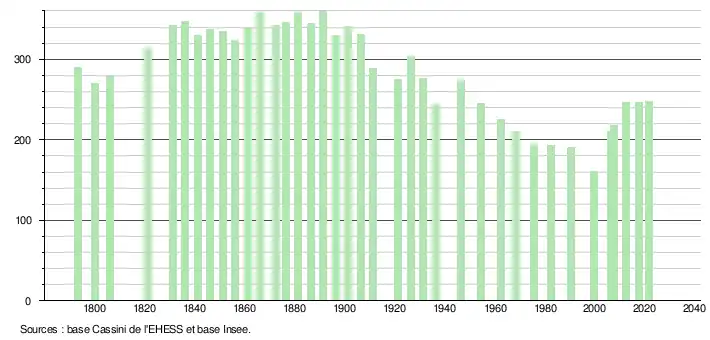 L'évolution du nombre d'habitants est connue à travers les recensements de la population effectués dans la commune depuis 1793. Pour les communes de moins de 10 000 habitants, une enquête de recensement portant sur toute la population est réalisée tous les cinq ans, les populations légales des années intermédiaires étant quant à elles estimées par interpolation ou extrapolation[33]. Pour la commune, le premier recensement exhaustif entrant dans le cadre du nouveau dispositif a été réalisé en 2007[34].