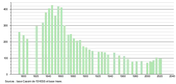 L'évolution du nombre d'habitants est connue à travers les recensements de la population effectués dans la commune depuis 1793. Pour les communes de moins de 10 000 habitants, une enquête de recensement portant sur toute la population est réalisée tous les cinq ans, les populations légales des années intermédiaires étant quant à elles estimées par interpolation ou extrapolation[32]. Pour la commune, le premier recensement exhaustif entrant dans le cadre du nouveau dispositif a été réalisé en 2004[33].