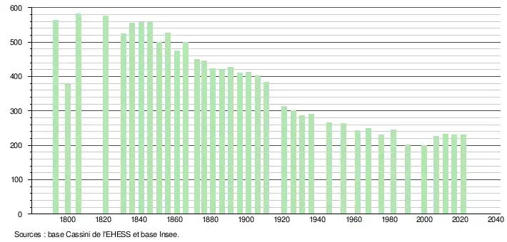 L'évolution du nombre d'habitants est connue à travers les recensements de la population effectués dans la commune depuis 1793. Pour les communes de moins de 10 000 habitants, une enquête de recensement portant sur toute la population est réalisée tous les cinq ans, les populations légales des années intermédiaires étant quant à elles estimées par interpolation ou extrapolation[30]. Pour la commune, le premier recensement exhaustif entrant dans le cadre du nouveau dispositif a été réalisé en 2006[31].
