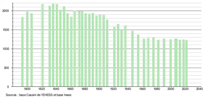 L'évolution du nombre d'habitants est connue à travers les recensements de la population effectués dans la commune depuis 1793. Pour les communes de moins de 10 000 habitants, une enquête de recensement portant sur toute la population est réalisée tous les cinq ans, les populations légales des années intermédiaires étant quant à elles estimées par interpolation ou extrapolation[16]. Pour la commune, le premier recensement exhaustif entrant dans le cadre du nouveau dispositif a été réalisé en 2007[17].
