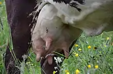 En période de disponibilité d'herbe, sauf lorsque les conditions climatiques ne le permettent pas, la ration de base du troupeau laitier est principalement composée d'herbe pâturée pendant une durée minimum annuelle cumulée de 120 jours. Pendant cette période, les éventuels apports de fourrages en complément de la ration d'herbe pâturée ne peuvent dépasser 3 kg de matière sèche par jour et par vache laitière, en moyenne sur le troupeau et sur la période de pâturage[51]. En période d'indisponibilité d'herbe, le fourrage représente la base de l'alimentation. Quelle que soit la période de l'année, les seuls fourrages autorisés sont composés de la flore locale des prairies et pâtures naturelles ou permanentes, ainsi que des graminées et légumineuses fourragères cultivées des prairies temporaires[51].