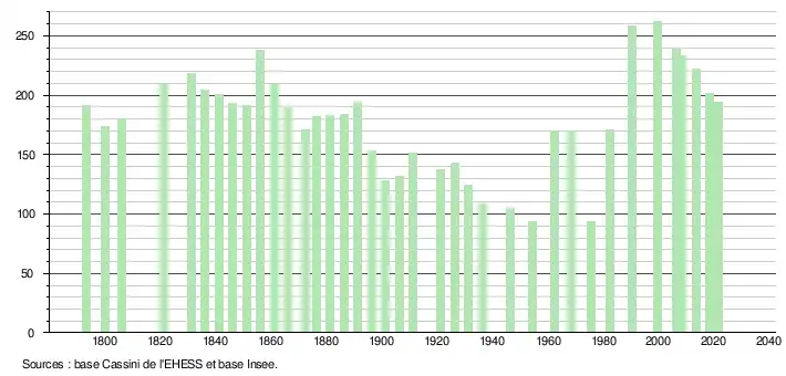L'évolution du nombre d'habitants est connue à travers les recensements de la population effectués dans la commune depuis 1793. Pour les communes de moins de 10 000 habitants, une enquête de recensement portant sur toute la population est réalisée tous les cinq ans, les populations légales des années intermédiaires étant quant à elles estimées par interpolation ou extrapolation[32]. Pour la commune, le premier recensement exhaustif entrant dans le cadre du nouveau dispositif a été réalisé en 2008[33].