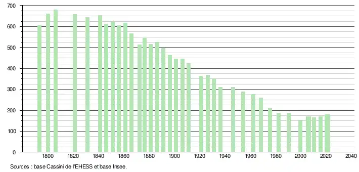 L'évolution du nombre d'habitants est connue à travers les recensements de la population effectués dans la commune depuis 1793. Pour les communes de moins de 10 000 habitants, une enquête de recensement portant sur toute la population est réalisée tous les cinq ans, les populations légales des années intermédiaires étant quant à elles estimées par interpolation ou extrapolation[23]. Pour la commune, le premier recensement exhaustif entrant dans le cadre du nouveau dispositif a été réalisé en 2005[24].