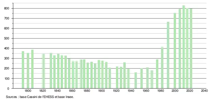L'évolution du nombre d'habitants est connue à travers les recensements de la population effectués dans la commune depuis 1793. Pour les communes de moins de 10 000 habitants, une enquête de recensement portant sur toute la population est réalisée tous les cinq ans, les populations légales des années intermédiaires étant quant à elles estimées par interpolation ou extrapolation[21]. Pour la commune, le premier recensement exhaustif entrant dans le cadre du nouveau dispositif a été réalisé en 2006[22].