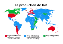 En 2009, le plus grand producteur de lait et de produits laitiers est l'Union européenne suivie par l'Inde, les États-Unis, la Chine, l'Allemagne, le Brésil et la Russie[37]. Tous les membres de l'Union européenne réunis ont produit environ 138 millions de tonnes de lait en 2011[38]. Dans le monde entier, les fermes laitières ont produit environ 730 millions de tonnes de lait en 2011 notamment consommées par l'Inde, l'Europe, l'Australie et les États-Unis, la Chine et la Russie[39],[40].