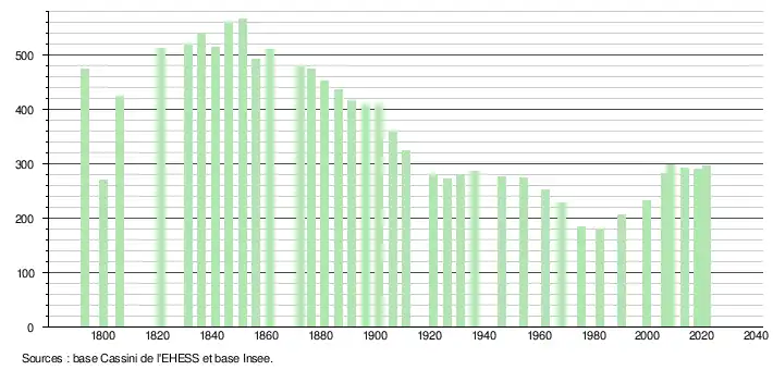 L'évolution du nombre d'habitants est connue à travers les recensements de la population effectués dans la commune depuis 1793. Pour les communes de moins de 10 000 habitants, une enquête de recensement portant sur toute la population est réalisée tous les cinq ans, les populations légales des années intermédiaires étant quant à elles estimées par interpolation ou extrapolation[25]. Pour la commune, le premier recensement exhaustif entrant dans le cadre du nouveau dispositif a été réalisé en 2008[26].