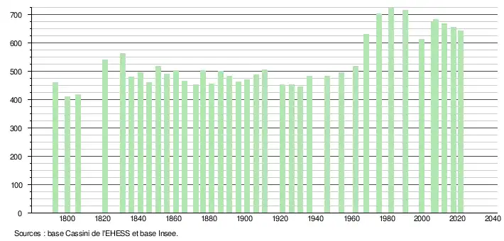 L'évolution du nombre d'habitants est connue à travers les recensements de la population effectués dans la commune depuis 1793. Pour les communes de moins de 10 000 habitants, une enquête de recensement portant sur toute la population est réalisée tous les cinq ans, les populations légales des années intermédiaires étant quant à elles estimées par interpolation ou extrapolation[26]. Pour la commune, le premier recensement exhaustif entrant dans le cadre du nouveau dispositif a été réalisé en 2007[27].