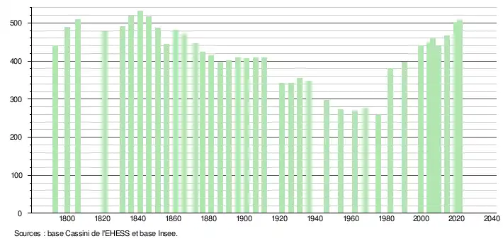 L'évolution du nombre d'habitants est connue à travers les recensements de la population effectués dans la commune depuis 1793. Pour les communes de moins de 10 000 habitants, une enquête de recensement portant sur toute la population est réalisée tous les cinq ans, les populations légales des années intermédiaires étant quant à elles estimées par interpolation ou extrapolation[30]. Pour la commune, le premier recensement exhaustif entrant dans le cadre du nouveau dispositif a été réalisé en 2004[31].