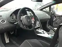 Cette réduction du poids touche également l’habitacle de la Gallardo, avec un recours massif à la fibre de carbone[7], que l’on retrouve à divers endroits du poste de conduite : coque des sièges baquets, frein à main, volant, panneaux intérieurs des portières, console centrale[11]. Autre matériau privilégié : l’alcantara[12], tissu synthétique produit par la firme italienne du même nom, qui présente l’avantage d’être bien plus léger que le cuir tout en autorisant un aspect haut de gamme grâce à son toucher agréable[13]. En sont notamment recouverts le tableau de bord, les sièges et la jante du volant[réf. nécessaire].