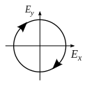 - la polarisation circulaire: les champs électriques et magnétiques de la lumière oscillent sur un cercle. Le vecteur de Jones correspondant est : avec . Le signe de l'angle φ dépendant du sens de parcours du cercle par le champ électromagnétique.