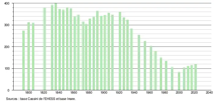 | L'évolution du nombre d'habitants est connue à travers les recensements de la population effectués dans la commune depuis 1793. Pour les communes de moins de 10 000 habitants, une enquête de recensement portant sur toute la population est réalisée tous les cinq ans, les populations légales des années intermédiaires étant quant à elles estimées par interpolation ou extrapolation[31]. Pour la commune, le premier recensement exhaustif entrant dans le cadre du nouveau dispositif a été réalisé en 2006[32]. En 2021, la commune comptait 121 habitants[Note 2], en augmentation de 2,54 % par rapport à 2015 (Corrèze : −0,86 %, France hors Mayotte : +1,84 %). |