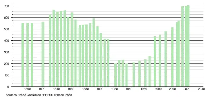 L'évolution du nombre d'habitants est connue à travers les recensements de la population effectués dans la commune depuis 1793. Pour les communes de moins de 10 000 habitants, une enquête de recensement portant sur toute la population est réalisée tous les cinq ans, les populations légales des années intermédiaires étant quant à elles estimées par interpolation ou extrapolation[32]. Pour la commune, le premier recensement exhaustif entrant dans le cadre du nouveau dispositif a été réalisé en 2008[33].